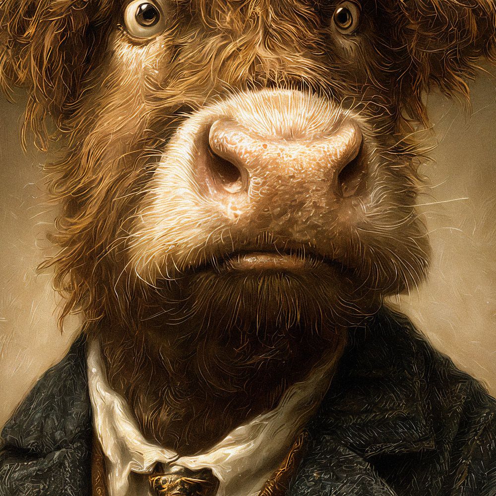 Malerisch-surreales Porträt eines Stiers in einem klassischen Kostüm. Humorvoll und stilvoll, eine Mischung aus Tier und Mensch im altmeisterlichen Stil. Perfekt als markantes und verspieltes Kunstwerk in einem modernen oder klassischen Interieur