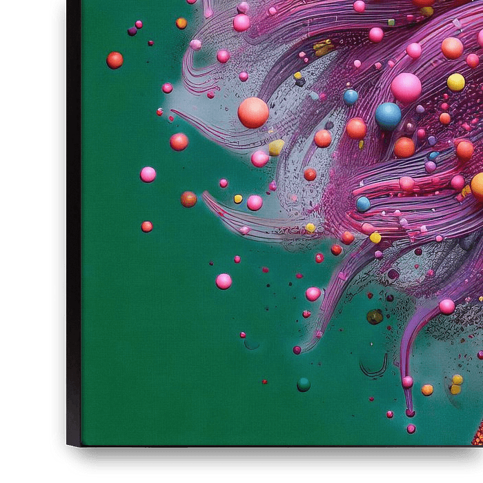 Bei diesem Kunstwerk von mir handelt es sich um eine digitale Wiedergabe des Seitenprofils einer Frau, die in eine lebendige Landschaft aus abstrakten Formen und Farben verwandelt wurde. Ihre Gedanken scheinen in einer Explosion kugelförmiger Elemente unterschiedlicher Größe und in Rosa-, Gelb- und Blautönen zum Leben zu erwachen, die…