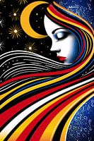 Dieses bezaubernde Kunstwerk entführt Sie in eine Welt, in der Schönheit und Geheimnis verschmelzen. Eine in die Farben der Nacht gehüllte Frau ist von einem Wirbelwind aus Sternen und kosmischer Energie umgeben. Ihr fließendes Haar und ihr heiterer Gesichtsausdruck strahlen Ruhe und Harmonie aus, während die leuchtenden Farben und…