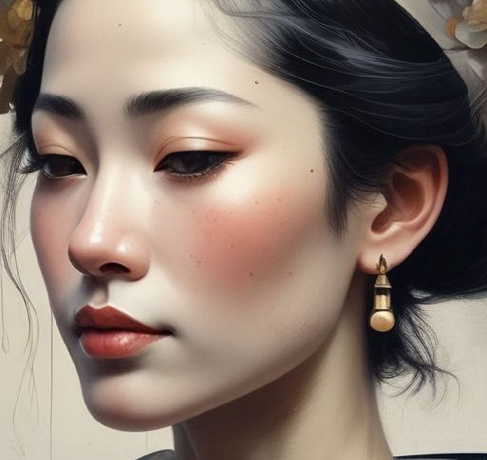 Ein Minimalismus-Porträt einer Geisha-Frau mit verziertem Seiden-Haarband und goldenen Blumen in einer traditionellen Tracht blaues Kleid Blick zur Seite auf einem beige braun grau Hintergrund gemalt.