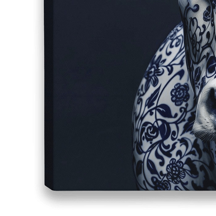 Die leuchtenden Blautöne, die für Delfter Porzellan charakteristisch sind, kontrastieren wunderschön mit der Tiefe des Hintergrunds und erzeugen einen dramatischen und zugleich raffinierten Effekt. Die Symmetrie der Komposition schafft ein visuelles Gleichgewicht, das den Betrachter einlädt, die Schönheit und Komplexität des Stücks zu erkunden.