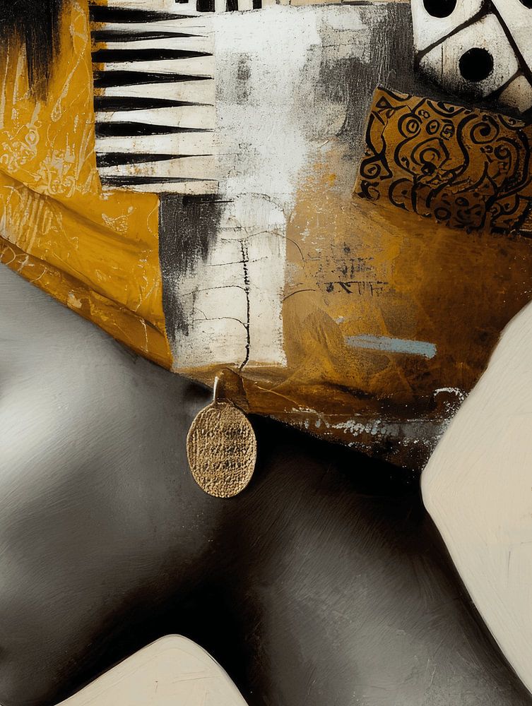 Dieses kraftvolle Porträt zeigt eine Frau im Profil, ruhig und selbstbewusst, mit einem ruhigen, aber durchdringenden Blick. Der Kontrast zwischen dem weich modellierten Gesicht in Grautönen und dem reichhaltigen, mehrschichtigen Kopfschmuck lässt dieses Werk sofort ins Auge fallen. Der Kopfschmuck besteht aus abstrakten Formen, Mustern…