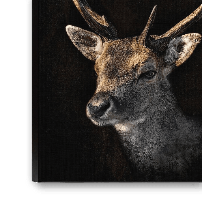 Porträt eines Hirsches mit dunklem Hintergrund und großem Geweih als Gemälde.