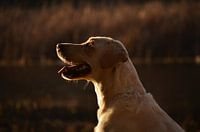 Fotografie eines Labradorhundes (die am weitesten verbreitete Hunderasse der Welt) mit dem Licht des Sonnenuntergangs auf seinem Körper an einem Tag, an dem er im Wald neben einem See spazieren geht.