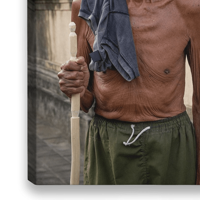 Porträt eines Mannes in einem Dorf auf Bali. Der Mann trägt einen grauen Hut, kein Hemd und hat einen Stock in der Hand. Freundliches, faltiges Gesicht, mit einem freundlichen Lächeln.