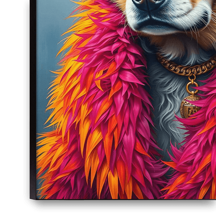 Dieses eindrucksvolle Gemälde zeigt einen Pittbull, wie man ihn selten sieht: selbstbewusst, elegant und mit einem ausgeprägten Sinn für Stil. Der Hund steht stolz aufrecht und ist mit einem auffälligen rosa Federmantel bekleidet, der sofort die Aufmerksamkeit auf sich zieht. Auf dem Kopf trägt er…