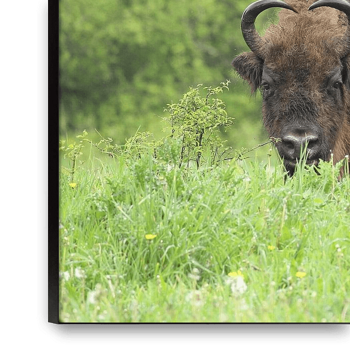 Ein Porträt eines europäischen Wisents am Waldrand. Diese beeindruckenden Herdentiere sind akut vom Aussterben bedroht. Dieses Tier ist Teil eines Zuchtprogramms zur Erhaltung der Art.