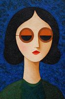 Ein stilisiertes Porträt, in dem sich Schlichtheit und grafische Elemente vereinen. Die großen, runden Formen um die Augen verleihen dem Bild einen wiedererkennbaren, fast ikonischen Charakter. Der tiefblaue Hintergrund verstärkt den Kontrast zu den warmen Hauttönen und den roten Lippen. Durch die geschlossenen Augen erhält das Werk…