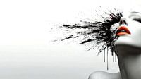 Ein künstlerisches Porträt einer Frau mit leuchtend orangefarbenen Lippen und einem dramatischen Spritzer schwarzer Tinte, der sich über ihr Gesicht zieht. Der Kontrast zur weißen Hintergrundfläche verstärkt die visuelle Wirkung und sorgt für eine ausdrucksstarke und moderne Ästhetik.