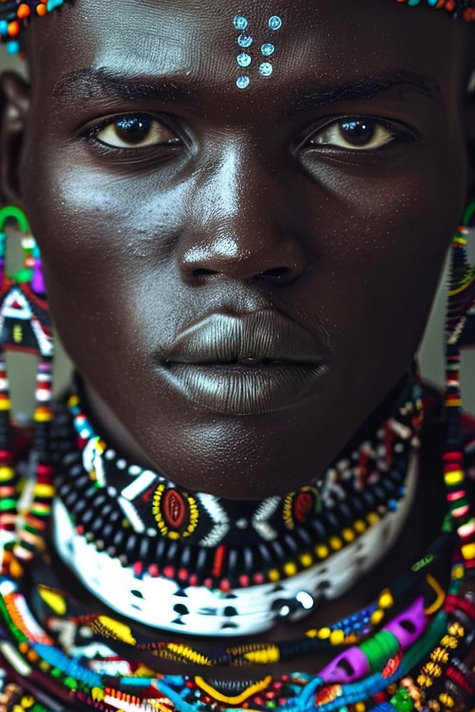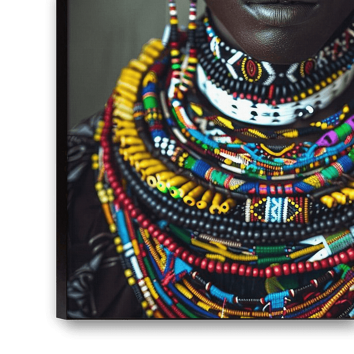 Dieses farbenfrohe Porträt zeigt einen stolzen afrikanischen Mann in traditioneller Kleidung und prächtigem, handgefertigtem Perlenschmuck. Die kunstvoll gestalteten Perlenmuster und die kräftigen Farben der Kleidung zeugen von kultureller Identität und handwerklichem Geschick. Die Details der Halsketten, Ohrringe und Kopfbedeckung sind eindrucksvoll und strahlen eine majestätische Aura aus. Diese Fotografie ist ideal für Liebhaber afrikanischer Kunst und Kultur und fügt jedem Raum eine inspirierende und exotische Note hinzu.