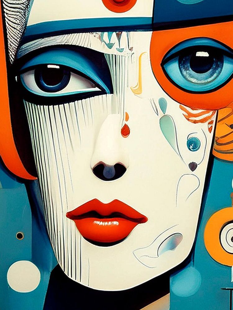 Das Porträt von Turgo zeigt eine Frau in einem kräftigen und stilisierten Bild, das von der abstrakten Kunst des 20. Jahrhunderts inspiriert zu sein scheint. Das Gesicht der Frau ist asymmetrisch und in geometrische Formen zerlegt, was an den Stil des Kubismus oder Surrealismus erinnert. Ihr rechtes Auge ist groß und hyperrealistisch in einem leuchtenden Blau dargestellt, das durch einen orangefarbenen Kreis und schwarze Linien hervorgehoben wird. Das linke Auge wirkt im Gegensatz dazu fast abstrakt, mit einer verlängerten Wimpernlinie. Ihr Kopf ist mit einem komplexen Gebilde bedeckt, das aus gelben, blauen und weißen Formen sowie feinen, parallelen Linien besteht, die dem Haar Struktur verleihen. Der Hintergrund ist ein leuchtendes Türkisblau, das mit orangefarbenen, weißen und schwarzen Kreisen und Halbkreisen gefüllt ist, die schwebenden Planeten oder abstrakten Symbolen ähneln. Diese Elemente schaffen eine dynamische und energiegeladene Atmosphäre. Die Farbwahl – vor allem das Zusammenspiel von Türkis, Orange und Gelb – ist sehr mutig und expressiv. Der Hals der Frau ist mit einem auffälligen, rot-weiß gestreiften Muster versehen, das an ein maritimes Thema erinnert und einen überraschenden Kontrast zu den anderen Elementen darstellt. Insgesamt ist das Bild eine kraftvolle und spielerische Darstellung, die eine faszinierende Mischung aus geometrischer Strenge und lebendiger Farbpalette darstellt.