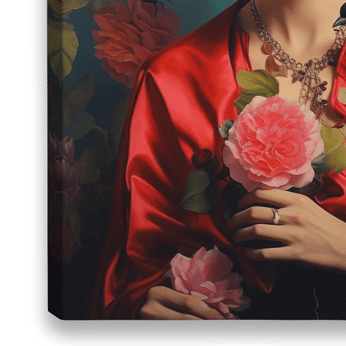 Bestelle dieses Vögel Wandbild Portrait Frida mit Vögeln und Rosen von Frank Daske | Foto & Design als Reproduktion auf Leinwand, Alu-Dibond, als Poster, Fototapete, ArtFrame oder Acrylglasbild, maßgefertigt in höchster Qualität.