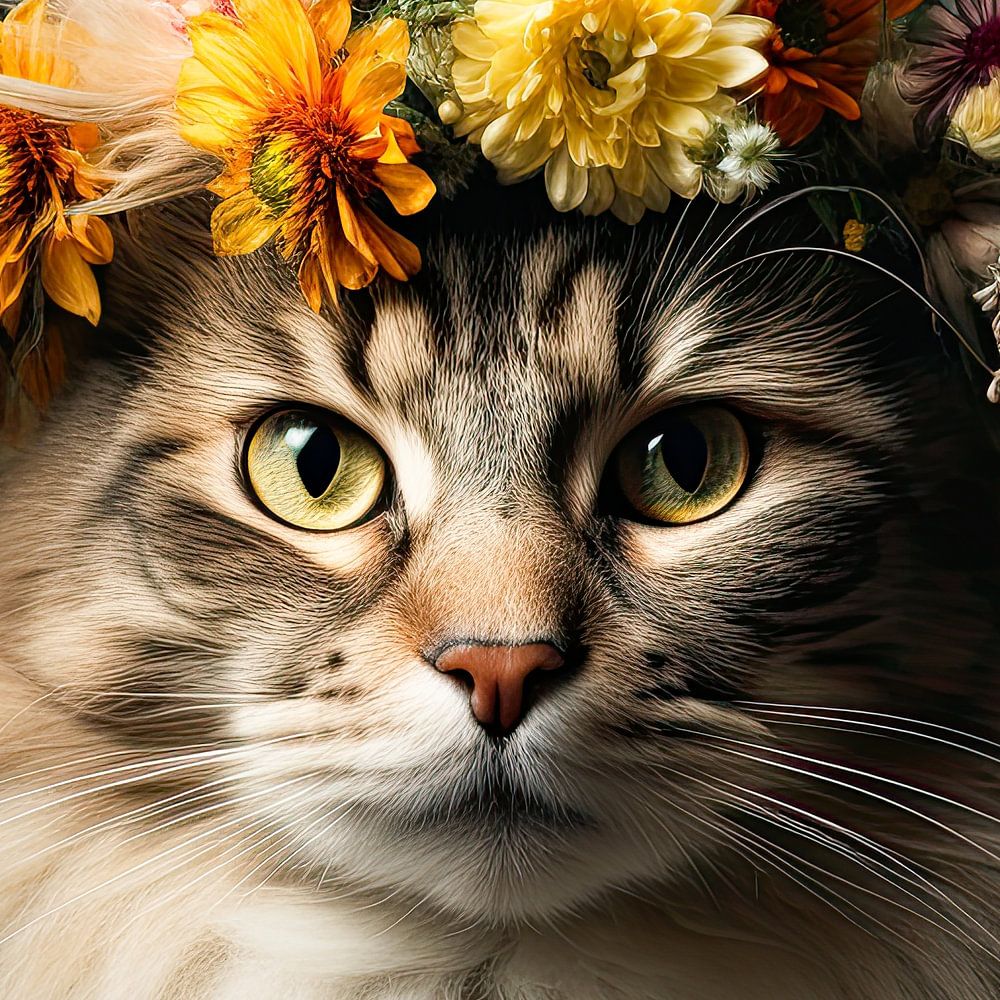Hochwertige Wanddekoration Druck einer Katze mit goldenen gelb-orange Blumenkranz. Diese detaillierte und lebendige Druck passt gut an der Wand, sowohl zu Hause und im Büro Umgebungen. Diese Katze Porträt wird eine anspruchsvolle und künstlerische Note zu Ihrem Interieur hinzuzufügen. Ideal für Tierliebhaber und alle, die nach einzigartigen und stilvollen Dekorationslösungen suchen. Bestellen Sie noch heute und verwandeln Sie Ihre Wände mit diesem schönen Bild.
