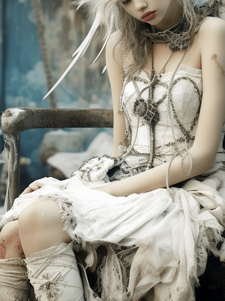 Dieses verträumte Bild zeigt eine zarte Figur mit großen, weißen Flügeln, die auf einer rostigen Metallschaukel in einer verlassenen Umgebung sitzt. Die Figur ist in einen mehrlagigen, zerfetzten weißen und cremefarbenen Rock gekleidet, der den Shabby-Chic-Stil unterstreicht. Ihr blondes Haar ist kunstvoll zerzaust und mit Blumen geschmückt, während ihr Blick sanft nach unten gerichtet ist, was eine melancholische und zerbrechliche Atmosphäre schafft. Der Hintergrund ist eine Mischung aus verwitterten blauen und grauen Oberflächen, die das Gefühl des Verfalls und der Vergänglichkeit verstärken. Es ist ein poetisches Bild, das Schönheit im Zerfall findet und eine fast ätherische Präsenz vermittelt.