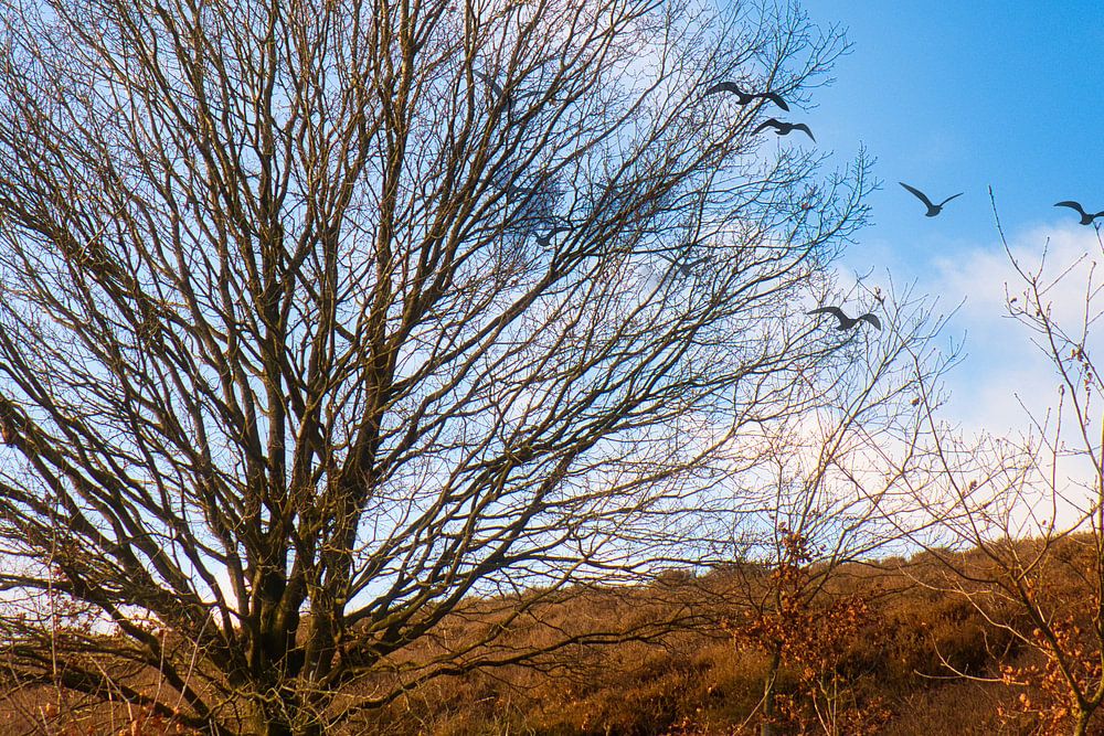 Ein schönes Bild von einem sonnigen Tag auf dem Veluwezoom (Posbank) in den Niederlanden mit Vögeln, die hinter dem Baum im Hintergrund fliegen.