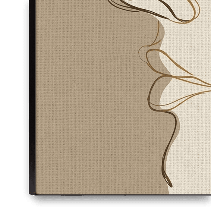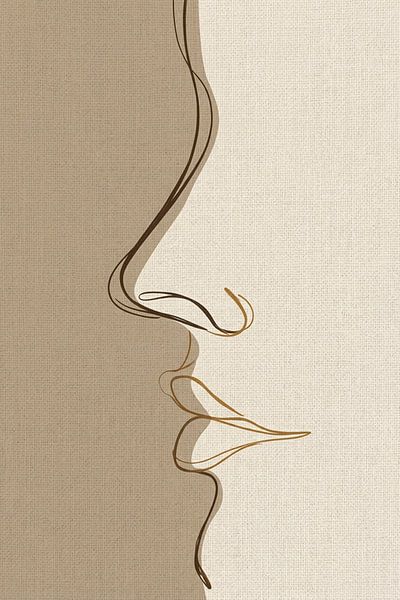 Profil eines Gesichts, gezeichnet in anmutigen, fließenden Linien vor einem warmen beigen Hintergrund mit Leinenstruktur. Die Zeichnung besteht nur aus Konturen - einer Nase, Lippen und einem Kinn - und spielt mit Transparenz und Überlappung, wodurch Tiefe und Weichheit geschaffen werden, ohne dass Schattierungen oder Farbverläufe…