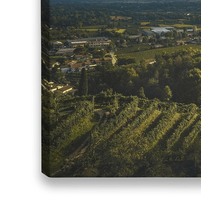 Prosecco-Hügel, Weinberge und die Kirche San Lorenzo bei Sonnenuntergang. Unesco-Stätte. Farra di Soligo. Region Venetien, Italien, Europa.