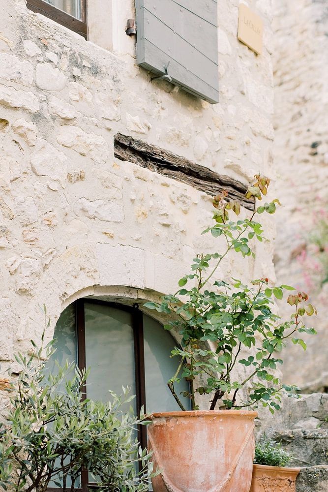 Feine, weiche südeuropäische Farbtöne: Sandfarben, olivgrün und grau. Die alten Steine des Hauses und der Treppe sowie die Pflanzen in Töpfen vermitteln das Bild eines typischen französischen Dorfes. Mit diesem Foto holen Sie sich ein Stück Frankreich in Ihr Zuhause!