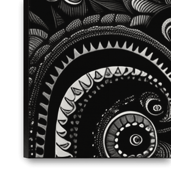 Ein hypnotisierendes Schwarz-Weiß-Kunstwerk, das das Universum in einem sehr detaillierten, abstrakten Stil abbildet. Geometrische Muster, wirbelnde Formen und kosmische Motive füllen die Komposition und schaffen eine traumhafte, psychedelische Atmosphäre. Vor einem dunklen Hintergrund heben sich die filigranen weißen Linien…