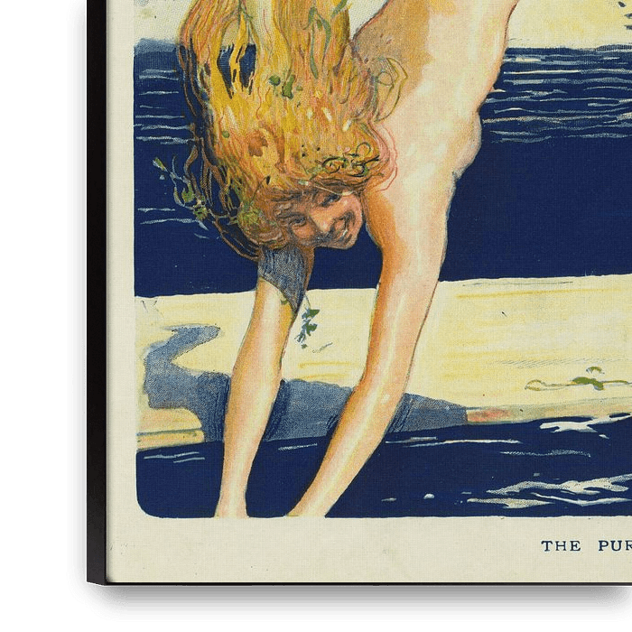 Am Strand jagen eine Reihe von Schwimmern, bereits Männer, einer Meerjungfrau, Sirene oder Meerjungfrau hinterher, die mit einem breiten Lächeln ins Meer taucht. Das Mädchen ist oben ohne, nackt und von hinten zu sehen. Die Männer schwimmen vom Strand weg, wo im Hintergrund Strandbesucher und ein Strandzelt zu sehen sind.