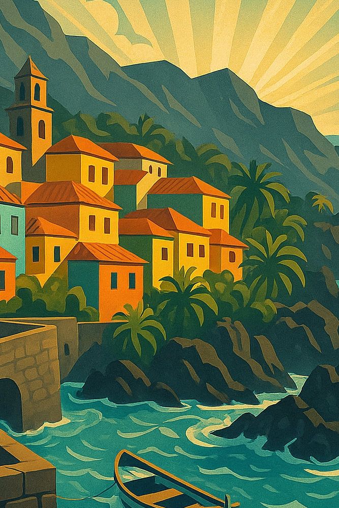 Holen Sie sich den zeitlosen Charme der Kanarischen Inseln in Ihr Zuhause mit diesem atemberaubenden Art Deco Poster von Puerto de la Cruz. Inspiriert von alten Reisebildern, fängt dieses Design die Essenz der farbenfrohen Küstenstadt auf Teneriffa ein, wo die Berge auf den Atlantischen Ozean treffen. Das Kunstwerk zeigt lebendige Häuser mit Terrakotta-Dächern, üppige Palmen und die dramatische Küstenlinie, die von türkisfarbenem Wasser umrahmt wird. Strahlende Sonnenstrahlen breiten sich über die Szene aus und vermitteln ein Gefühl von Wärme, Fernweh und Inselruhe.