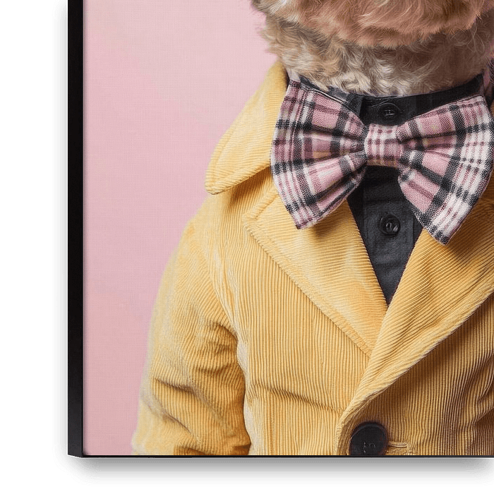 Ein stylischer Begleiter mit einer charmanten Frisur und witzigem Charisma erstrahlt in einem schlichten, gelben Sakko. Die übergroßen Sonnenbrillen verleihen ihm einen Hauch von Coolness, während die elegante Fliege ihm das Flair eines kleinen Gentlemans verleiht. Ein wahres Modehighlight, das Herzen im Sturm erobert!