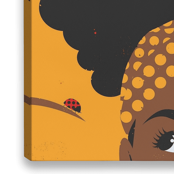 Meine grafische Illustration mit dem Titel "Dots!" zeigt eine junge schwarze Frau mit einem gepunkteten Kopftuch im Haar, die neugierig auf einen Marienkäfer blickt. Das Werk hat eine warme Farbpalette aus Orange, Braun, Schwarz und Rot, die eine gemütliche und fröhliche Atmosphäre schafft.