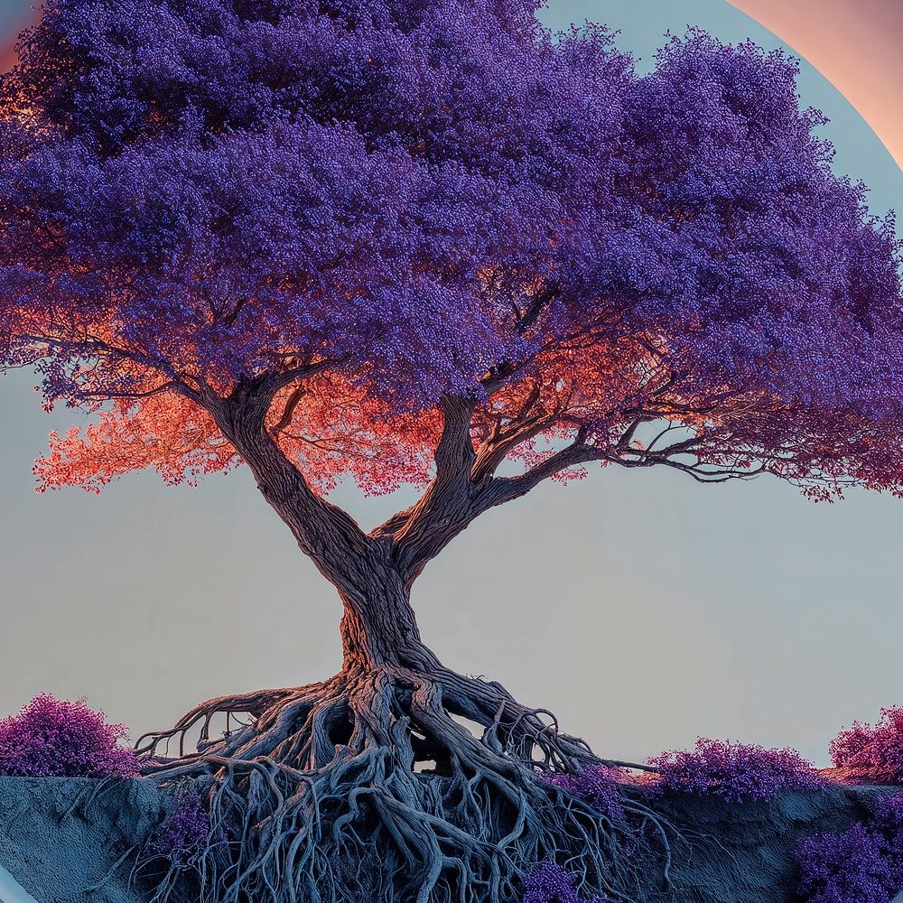 Das Kunstwerk zeigt einen auffälligen, stilisierten Baum in einem kreisförmigen Rahmen. Der Baum hat lebhafte violette Blätter und einen verdrehten Stamm mit dicken, knorrigen Wurzeln. Der kreisförmige Rahmen ist klar und minimalistisch, wodurch eine dynamische Komposition entsteht. Die Gesamtkomposition vermittelt ein Gefühl der Ruhe…