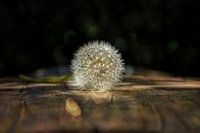 Eine Pusteblume auf einem alten Holztisch im Garten vor dunkel grünem Hintergrund mit Bokeh