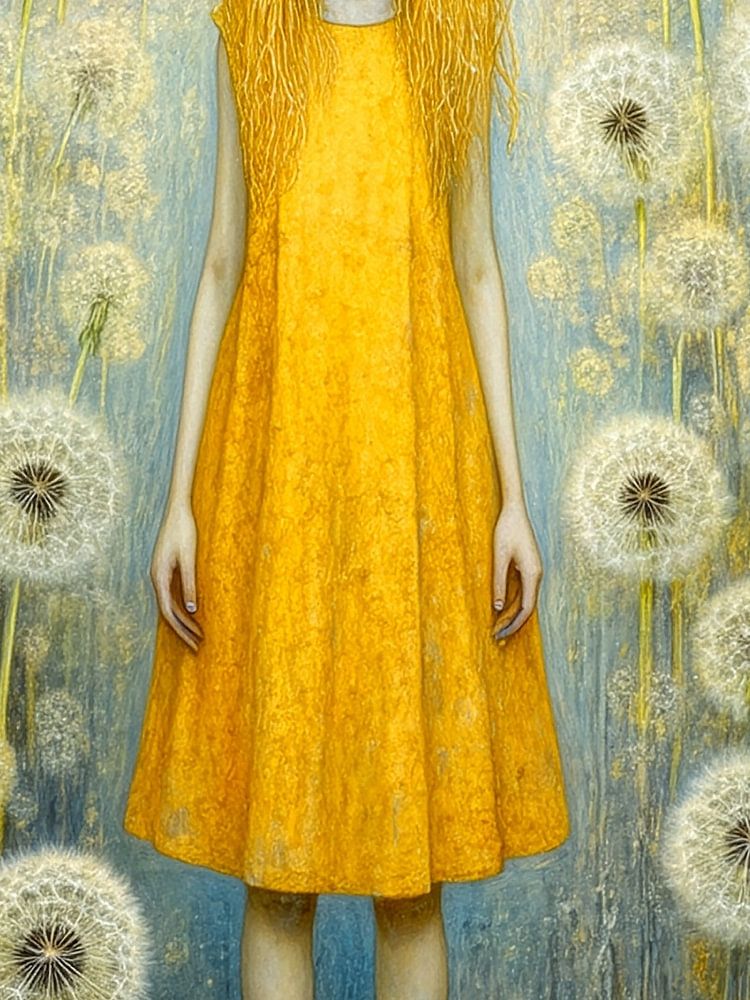 Ein Mädchen mit goldenen Haaren steht in einem Feld mit riesigen Pusteblumen. Auf dem Boden hockt eine Weinbergschnecke, die das Mädchen beobachtet.