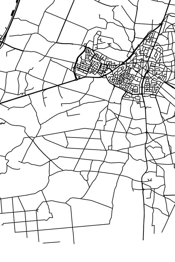 Schwarz-weiße Karte, Straßenkarte oder Straßenplan von Putten. Putten liegt an der Veluwe, in der Gemeinde Putten, Provinz Gelderland. Der Stadtplan enthält alle öffentlichen Straßen in Putten. Außerdem ist die Karte mit den Koordinaten des Zentrums von Putten versehen.
