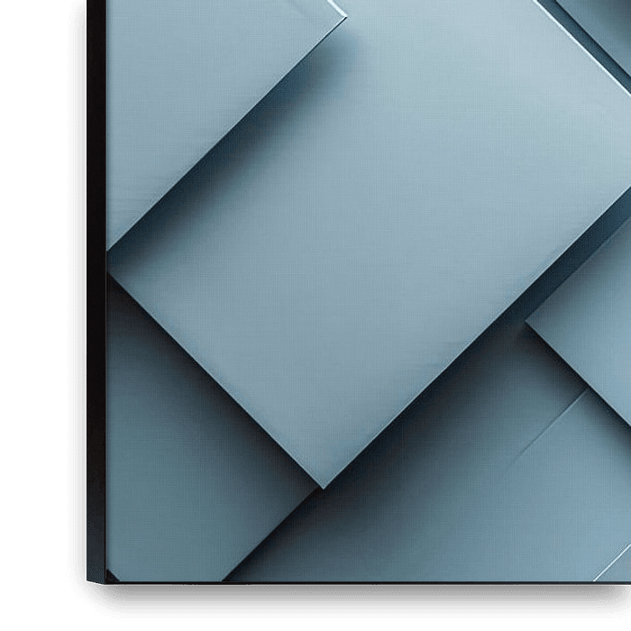 Das Werk verwendet verschiedene Schattierungen eines ruhigen, eisblauen Farbtons, der Ruhe und Sachlichkeit ausstrahlt. Die rechteckigen Formen sind so angeordnet, dass ein Gefühl von Tiefe und…