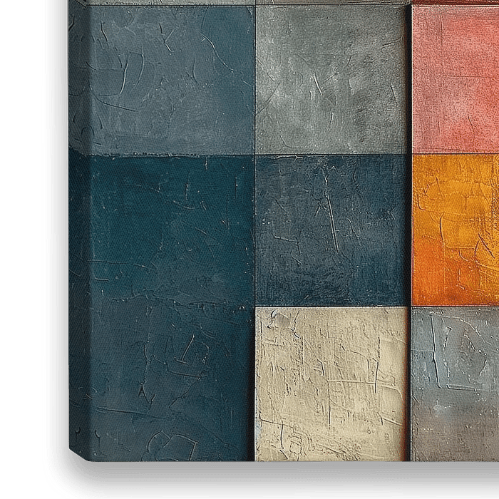 Ein abstraktes Kunstwerk mit einem Raster aus viereckigen Tafeln in verschiedenen Farbtönen. Die strukturierten Oberflächen schaffen eine visuell dynamische Komposition, die Farbkontraste und geometrische Anordnung hervorhebt.