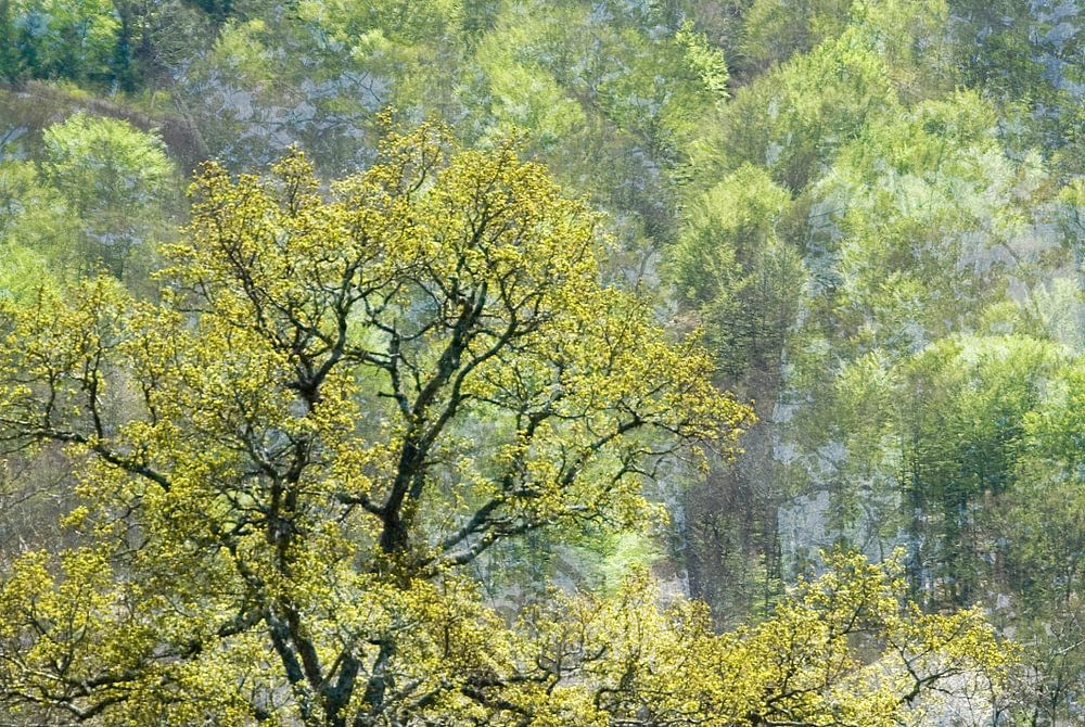 im frühen frühling fotografierte ich diese wälder in einer hügeligen landschaft in frankreich. zartgrüne blätter in verschiedenen schattierungen, jede baumart hat ihre eigene farbe. um tiefe zu geben und die idee zu schaffen, dass man in den wald gehen kann, habe ich im computer über das bild noch ein weiteres gelegt, nämlich einen großen baum mit einer offenen krone und wenigen blättern, wenn man genau hinschaut, sieht man diesen baum als eine art silhouette.