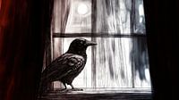 Ein schwarzer Rabe sitzt auf einem Fensterbrett und blickt intensiv auf den Vollmond. Eine durchscheinende Gardine verstärkt die geheimnisvolle und fesselnde Atmosphäre in dem schwach beleuchteten Raum.