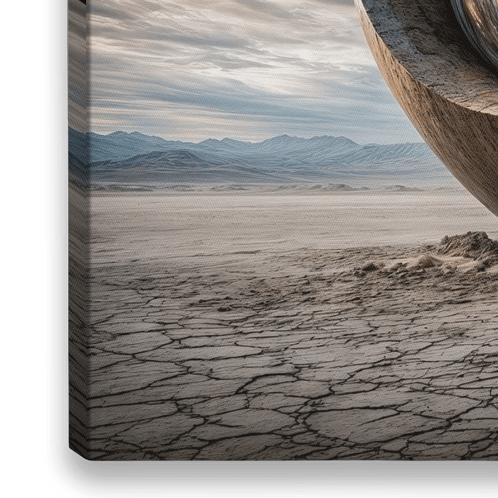 In einer endlosen Wüstenlandschaft ragen monumentale, kreisförmige Strukturen empor, deren massiver Stein von der Zeit selbst gezeichnet zu sein scheint. Jede dieser kolossalen Formen birgt in ihrem Inneren ein spiralförmiges, kosmisches Muster, das wie ein Fenster zu einer anderen Dimension wirkt. Der Betrachter wird in den Bann eines…