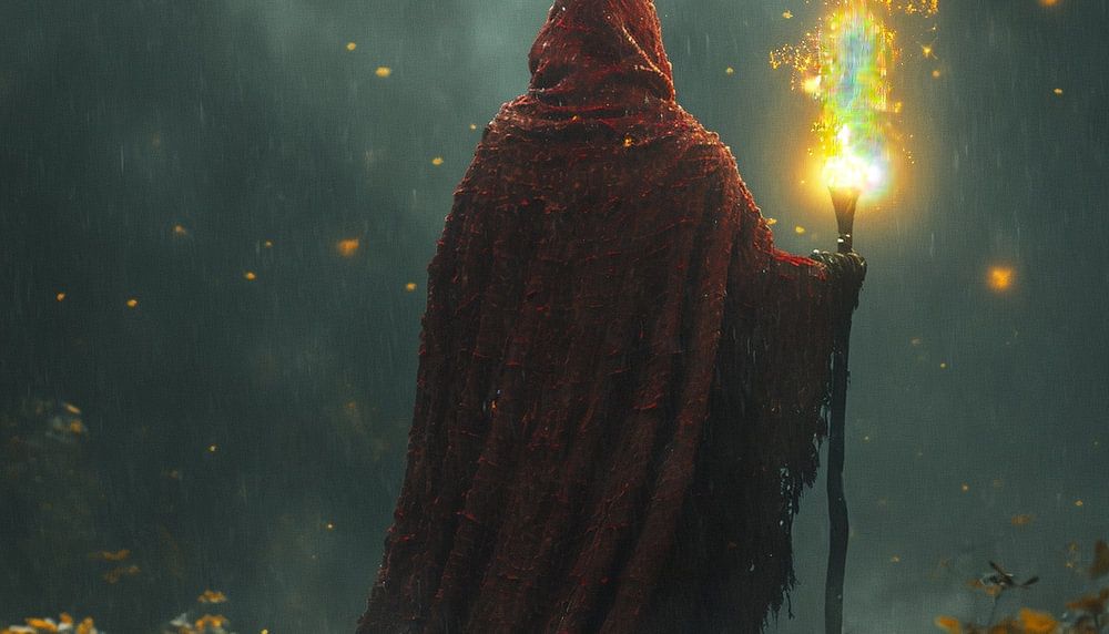 Dieses stimmungsvolle Bild zeigt eine geheimnisvolle, in einen roten Umhang gehüllte Figur, die eine leuchtende Fackel in der Hand hält. Sie steht inmitten eines dunklen Waldes, umgeben von einem zarten Schleier aus Regen und fallenden Blättern, die vom Wind getragen werden. Die warmen, goldenen Funken der Fackel stehen in starkem Kontrast zu dem kühlenden Blau und Grün der Umgebung und scheinen die Gestalt auf ihrem Pfad durch den nebelverhangenen Wald zu führen. Man kann die Feuchtigkeit und die frische Luft fast spüren, die den Wald erfüllen. Dieses Bild ruft Gefühle der Einsamkeit hervor, aber auch der Hoffnung und des Mutes, die die Figur ausstrahlt, während sie unbeirrt ihren Weg geht.