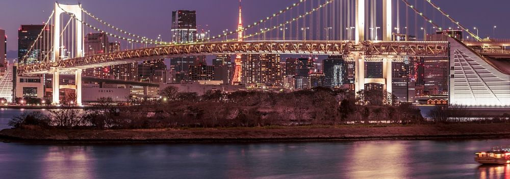 Abendpanorama von dieser riesigen Brücke in Tokio.