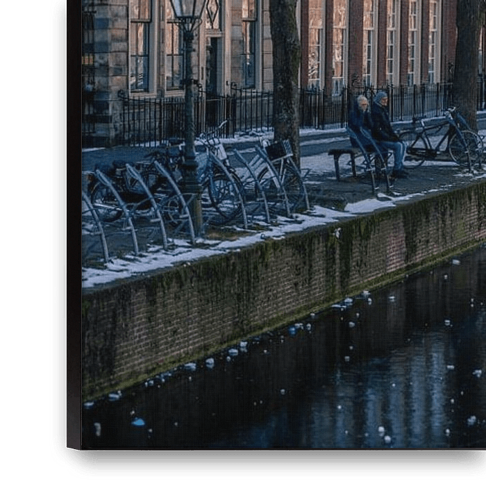 Ein seltenes Bild: eine zugefrorene Rapenburg mit ein paar Schlittschuhläufern, die sich auf das Eis wagen.