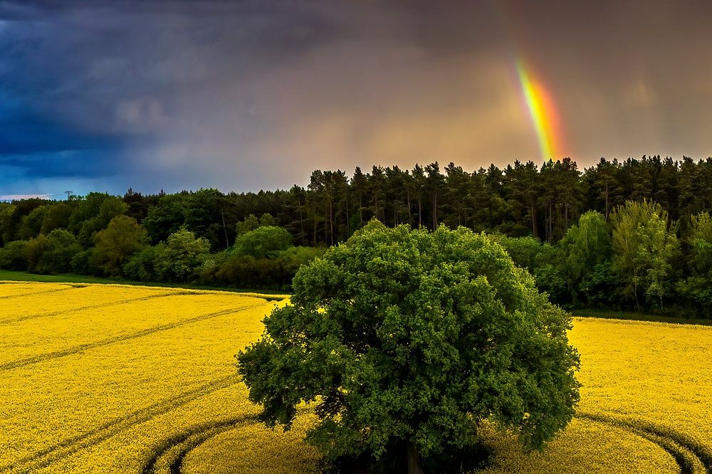 Das Foto mit dem Titel "Rapsfeld mit einem Baum in der Mitte und einem Gewitterhimmel und einem Regenbogen aus der Luft fotografiert" präsentiert eine atemberaubende Landschaft aus der Vogelperspektive, die die Schönheit und Unberechenbarkeit der Natur auf eindrucksvolle Weise einfängt.