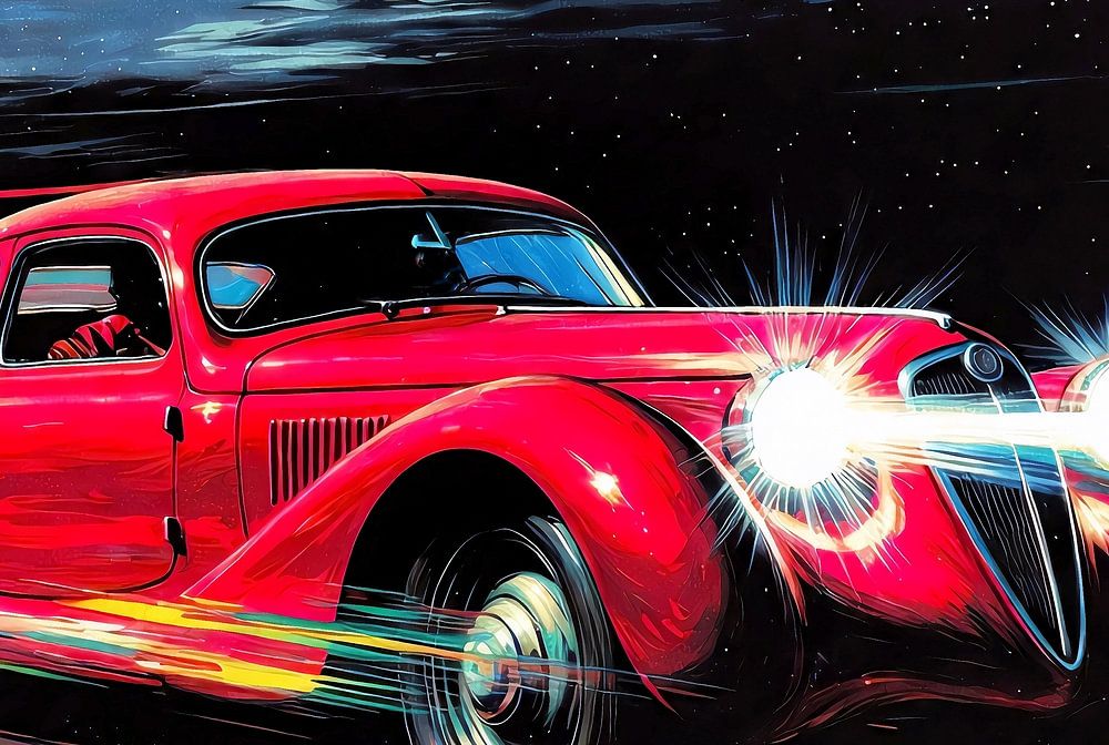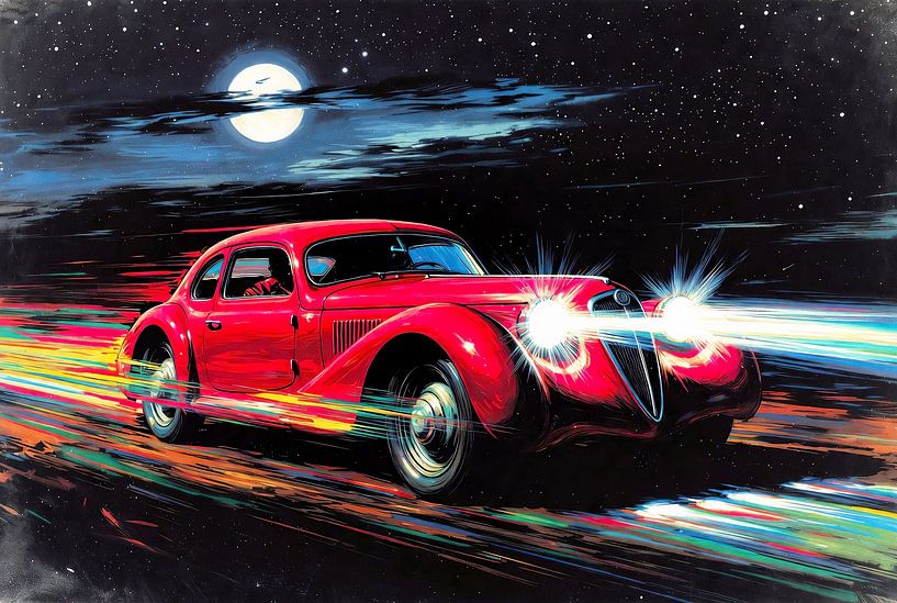 Bestelle das digitale Kunst Bild Rasanter roter Oldtimer von DeVerviersBelgium als Reproduktion auf Leinwand, Alu-Dibond, als Poster, Fototapete oder Acrylglasbild.