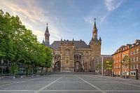Blick über den Katschhof zum Aachener Rathaus bei Sonnenuntergang.