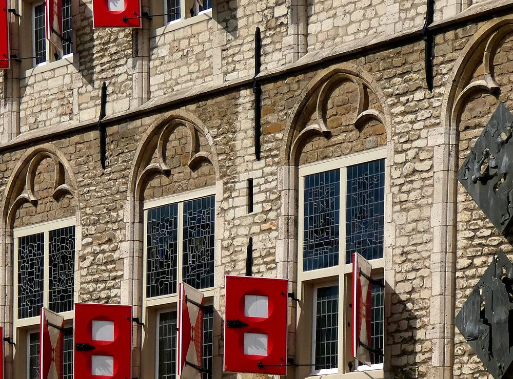 Ein schönes monumentales Gebäude in der Mitte des Marktplatzes von Gouda. Die fröhlichen knallroten Fensterläden zieren das große Gebäude. Hier ist ein Teil fotografiert, das sich dadurch auszeichnet. Ein schönes Stadtbild von Gouda!