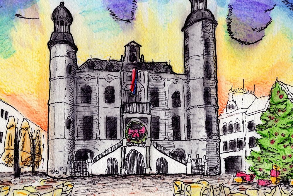 Das Rathaus von Venlo, Terrassen, Sonnenuntergang und ein Weihnachtsbaum.