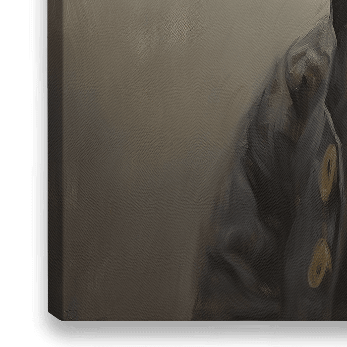 Ratte im Mantel - Das Gemälde zeigt eine Ratte in einem schwarzen Mantel mit goldenen Knöpfen vor einem schlichten, neutralfarbenen Hintergrund. Diese realistische Darstellung tendiert zum Anthropomorphismus, indem das Tier in menschliche Kleidung gekleidet wird, was ihm Charakter und Geschichte verleiht. Die überwiegend warmen Farbtöne…