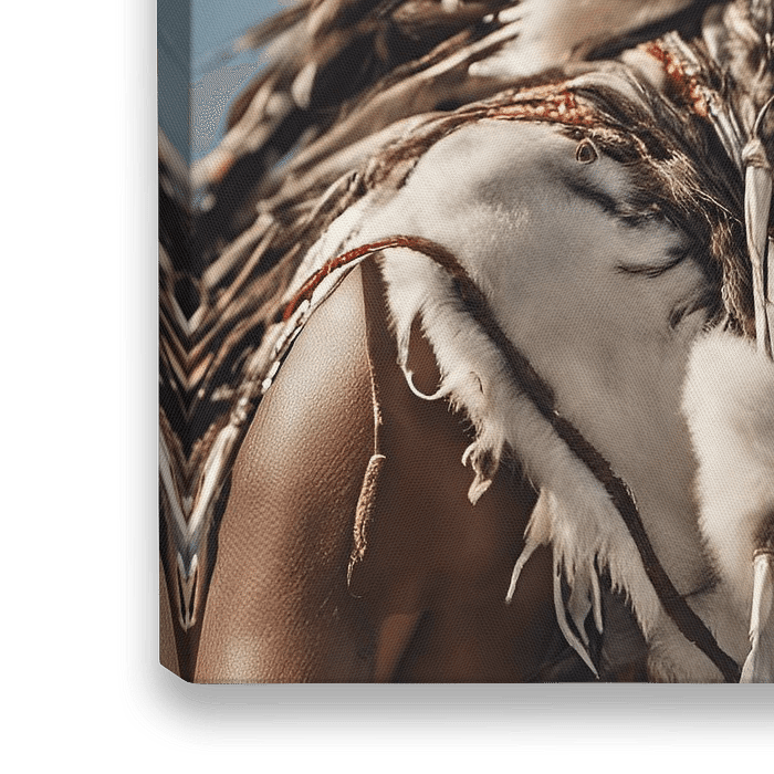Eine Person trägt einen kunstvollen indianischen Kopfschmuck aus Federn und traditionellen Perlenarbeiten. Sie ist mit komplizierten Schmuckstücken und Kleidungsstücken geschmückt, die das kulturelle Erbe symbolisieren, und blickt mit einem Blick voller Stärke und Stolz in die Kamera.
