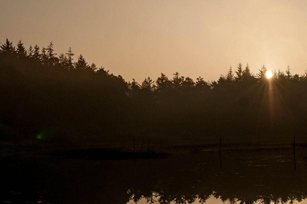 De weerspiegeling van de bomen in het water van het meertje geven een mysterieus plaatje. De zon stijgt net boven de naaldbomen uit. Het is herfst en de mist is net opgetrokken.