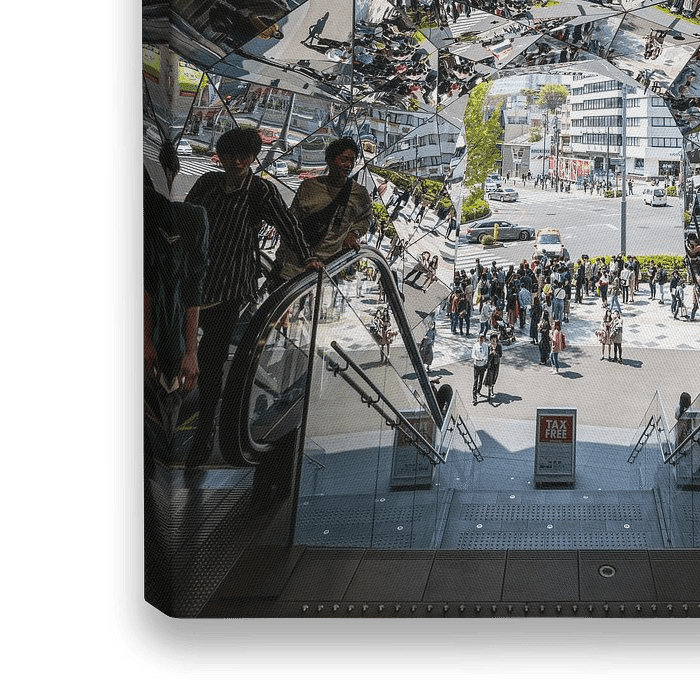 Reflexion in einem Saal voller Spiegel in Harajuku in Tokio, Japan. Die Spiegel reflektieren die Masse der Menschen. Rolltreppen an der Seite. Silhouette von Menschen.