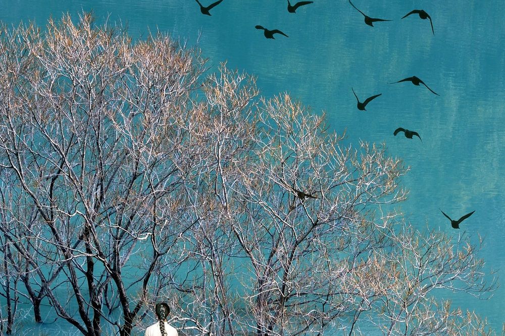 Surrealistische Szene in überwiegend blauen und türkisen Tönen mit einem Mädchen in einem See mit Bäumen und der Spiegelung des Wassers und der Vögel im Himmel.