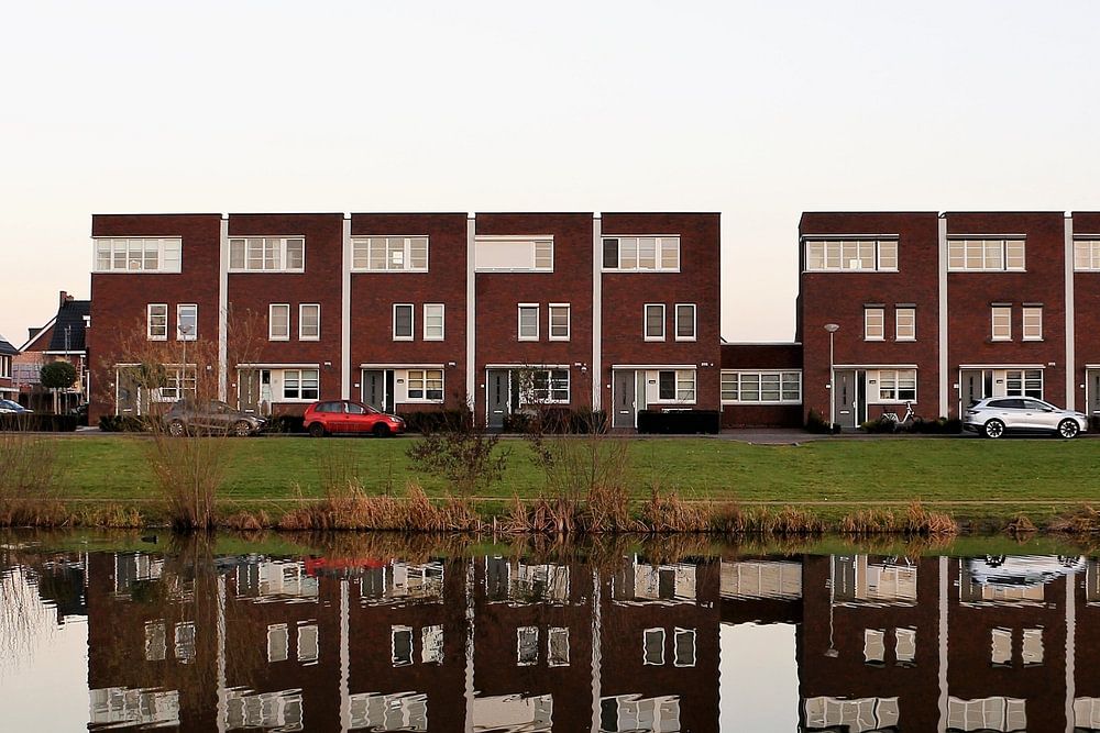 Reflexion, Spiegelbild im Wasser, Straße im Wohngebiet De Groote WIelen